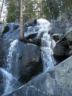 Quaking Aspen Falls (also called Tioga Pass Falls) is a 25-foot, multi-stranded waterfall off Tioga Pass Road in Yosemite National Park. Although the falls typically dry up by August, the stream flows year-round both above and below the falls.