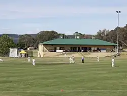 Cricket began to be played in an organised fashion in New South Wales in the 1830s.[2] On January 2, 1863 a meeting of twenty five persons was held in Mr. W. Lee's long room to establish the 'Queanbeyan Cricket Club', "to pay yearly in advance, in order to prevent the breaking down, such as other clubs had, by the trouble of collecting monthly subscriptions." Mr. Wright was elected to the office of president; Mr. WV. Scrivenor, treasurer; Mr. DeLissa, secretary; and Messrs. Morton, Kinseln, Davis and Doyle to be members of the committee.[1] In the 1850s a more informally structured 'Queanbeyan Club' or 'Queanbeyan District Club' had played cricket against teams from Braidwood,[3] Gininderra,[4] Goulburn (the 4th such match being played in 1859)[5] and Yass.[6] Occasional games were also played in the 1850s between the married and single members of the Queanbeyan club.[7] Queanbeyan's first police magistrate Captain AT Faunce died while playing cricket for the Queanbeyan club on 26 April 1856,[8] having been instrumental in introducing cricket to the region[9][10][11] (he and his brother having played for a Military team in Sydney in the 1830s including against the Australian Cricket Club at Hyde Park in 1833[12] and the Racecourse in 1834,[13][14] as well as against an Australian civilian XI in 1834).[15][16] His son, the Rev. Canon AD Faunce of the Goulburn Diocese and St Clement's Church at Yass also played for the Queanbeyan Club in the 1850s[17] and 1860s.[18][19][20]