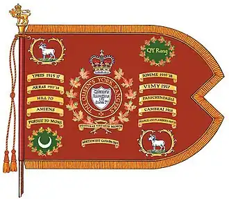 The following list are the battle honours awarded to the battalions and regiments perpetuated by the Rangers as well as to the Rangers themselves. They are organized by the campaign. Battle honours in small capitals are for large operations and campaigns and those in lowercase are for more specific battles. Bold type indicates honours emblazoned on the regimental guidon. Guidons were presented in 1984 and in 2022. The 2022 guidon is the first to include honours from the War of 1812 and Afghanistan.[11]