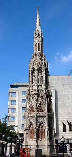 Barry based the memorial on the three surviving drawings of the Charing Cross, in the Bodleian Library, the British Museum and the collection of the Royal Society of Antiquaries. However, due to the fragmentary nature of this evidence, he also drew from a wider range of sources including the other surviving Eleanor crosses and Queen Eleanor's tomb at Westminster Abbey.[2] In this search for precedents Barry was assisted by his fellow architect Arthur Ashpitel.[3] The coats of arms of England, León, Castile and Ponthieu appear on the monument.[1]