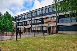 In 1966 the boys grammar school (between St Martins Lane and Western Road) incorporated the Crediton High School For Girls (which had been founded in 1911 on the adjoining site to the west).[4] To accommodate the merger, a new multistorey block was built (aligned north-south) on the slope between the former schools.