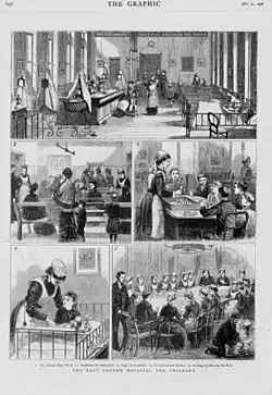 One of its origins lies in the Dispensary for Women and Children, founded in Bethnal Green in the East End of London by two Quaker sisters, Ellen and Mary Philips, in 1867.[4][5] The following year it moved to premises in Hackney, re-focused on pediatrics, and was renamed the North Eastern Hospital for Children, opened by Princess Louise.[6] The hospital continued to expand and a substantial new building was opened by Princess Beatrice in 1902.[7] This organisation became the Queen's Hospital for Children in 1907.[4]