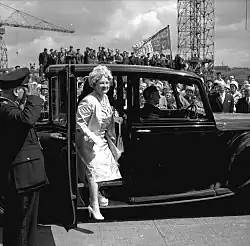 The Cunard White Star Line's RMS Queen Elizabeth was named after her. She launched the ship on 27 September 1938 in Clydebank, Scotland. Supposedly, the liner started to slide into the water before Elizabeth could officially launch her, and acting sharply, she managed to smash a bottle of Australian red over the liner's bow just before it slid out of reach.[180] In 1954, Elizabeth sailed to New York on her namesake.[181]