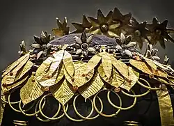 Queen Puabi's headdress is a 2600–2450 BCE Mesopotamian crown consisting of ornate gold leaf wreaths, strands of lapis lazuli and carnelian beads, with a gold comb, and delicate hair ribbons.[1] The entirety of the headdress is estimated to weigh over 6 pounds.[2] The headdress was discovered resting on Queen Puabi's remains in PG 800 during the excavation of the Royal Cemetery at Ur that began in 1922 and concluded in 1934.[3][1] Successive Mesopotamian societies built new cities on top of previous civilizations and commonly created tells (multilayer man-made mounds) to preserve human remains.[4] These younger tells (built on top of Queen Puabi's grave) hid and protected her immense riches by making them inaccessible to looters.[4] Found next to Queen Puabi's remains was a cylinder (identification) seal with the title "nin" inscribed, indicating a great lady or queen.[5] In the grave, excavators also found the remnants of female attendants – adorned in similar jewelry and hair ribbons – whose purpose was to serve the queen in her afterlife.[6] The religious significance of Queen Puabi's headdress demonstrates her royal status as well as her cultic importance.[7] The unearthing of Ur was led by Charles Woolley and was a joint expedition sponsored by the Penn Museum and the British Museum.[4] The headdress currently resides in the Penn Museum in Philadelphia. The excavation is still very popular because of the riches discovered, the uncovering of a mass grave, and the potential connection with Abraham from the book of Genesis. [4]