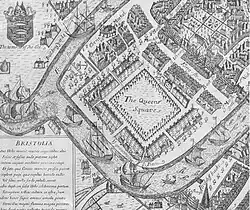 The square was named in honour of Queen Anne, who visited Bristol in 1702, and it became the home of the merchant elite. It was conveniently placed for both arms of the harbour, but its low-lying position surrounded on three sides by a tidal river had disadvantages too: an 'assemblage of nastiness' floated in the river, and when the tide failed to carry this away it offended the eyes and nostrils of those living in the square. This was one of the factors which ultimately led the wealthy to the move up the hill to Clifton.[9]