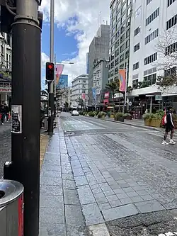 The 2006–2008 project repeatedly increased in cost, from NZ$23 million to around NZ$43.5 million, with some aspects (such as an improved entrance to Myers Park) falling victim to the blowout.[20] While Council noted in June 2007 that progress had often been quicker than expected,[21] the cost overruns, and the long duration of the construction works – which substantially affected pedestrian and motor vehicle traffic as well as retail sales[22] – made the upgrade unpopular in public, at least during the duration. It also became a problem issue for Dick Hubbard in his failed campaign for re-election to Mayor of Auckland in 2007. The upgrade is now considered to have generally been a success, and it won the 2009 Urban Design Award of the New Zealand Institute of Architects, which commended it for creating a quality public realm and sense of place.[17]