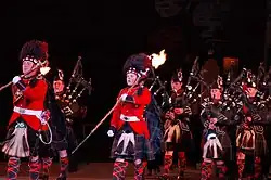 A strong military ethos is still maintained by a competing pipe band and Combined Cadet Force (CCF) section.[7] The school has its own "colours" which are paraded nearly every Sunday during term times in the school chapel, its own cap badge, and pupils wear the Clan Stewart hunting tartan. The school pipe band used to play at every rugby home international at Murrayfield Stadium, Edinburgh.