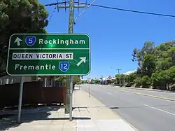 | 1.2 | 0.75 | Beach Street – East Fremantle, Bicton | Access to Fremantle railway station. No left turn permitted from Queen Victoria Street northbound to Beach Street. No right turn permitted from Beach Street to Queen Victoria Street southbound | ||