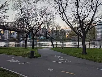 ![]() A jogging path in Queensbridge Park. The Queensboro Bridge is visible at left. | |