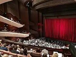 The Lyric Theatre, an auditorium with a proscenium stage and a seating capacity of 2,000, has an orchestra pit, a stalls and two upper balconies with seating. The space was designed for a medium reverberation time, ideal for opera, but can be acoustically modified for light opera, musicals and dramas through the use of absorber panels in the ceiling. Interior finishes include a colour-graded velour curtain, carpeted floors and tiers, stained veneered plywood wall panels, a lower ceiling of aluminium tubing and an upper ceiling of gypsum board, and upholstered theatre seats.[1]