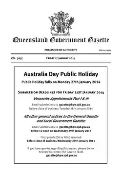 The Queensland Government Gazette is the government gazette of the Government of Queensland in Australia. It lists appointments and public notices including new legislation. Traditionally, publication in the gazette was a legal requirement for an announcement to be official; however, in present times, other methods of communication have replaced some aspects of the gazette's role. It is normally published weekly, but extraordinary editions can be published in between the regular weekly issues if there is an urgent need.[1]