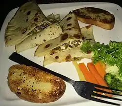 A quesadilla (/ˌkeɪsəˈdiːjə/; Spanish: [kesaˈðiʝa] ⓘ; Spanish diminutive of quesada[1][2]) is a Mexican dish consisting of a tortilla that is filled primarily with cheese (queso), and sometimes meats, spices, and other fillings, and then cooked on a griddle or stove.[3] Traditionally, a corn tortilla is used, but it can also be made with a flour tortilla.