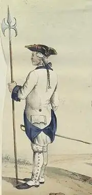 In the 18th century, European soldiers styled their traditionally long hair into a queue called the "soldier's queue." The 18th century custom of tying long powdered curly wigs (which normally reached down the back and chest) behind the neck began at first among soldiers and hunters, as seen as early as 1678 in a depiction of King of France Louis XIV hunting with his long hair tied back.[96][97] By the 1730s, the queue had spread from the military and became widespread also among civilians.[98] A 1697 depiction of a royal guard during the wedding of the Louis, Duke of Burgundy shows the sporting of this hairstyle, which came to influence civilian fashions due to the frequent wars France engaged in during Louis' reign.[99]
