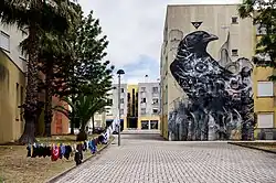 The Quinta do Mocho social housing project, consisting of four-story buildings, was built in the 1990s to house 3,000 people, mostly from former Portuguese colonies in Africa—Cape Verde, Guinea and Angola.[5] Social exclusion, high unemployment and poor housing standards contributed to the area having high crime rates and various social problems.[4] In order to improve the district's image, in 2014 local officials invited Portuguese and foreign artists to paint murals on its buildings.[6] The municipality has since stopped organising the project, however residents now maintain it and offer guided tours to visitors.[4] According to local officials, since the murals were painted, a bus line now serves the area, cultural events have multiplied, and the crime rate has fallen.[5][7]