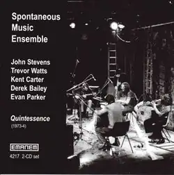 Quintessence is a live album by the Spontaneous Music Ensemble featuring percussionist/cornetist John Stevens saxophonists Trevor Watts and Evan Parker, guitarist Derek Bailey, and bassist Kent Carter which was recorded in 1973 and released on the Emanem label.[1][2][3] The album was first released in two parts on separate LPs entitles Eighty Five Minutes in 1986 then with additional material as two separate CDs entitled Quintessence in 1997 and finally as a single 2-CD set in 2007.