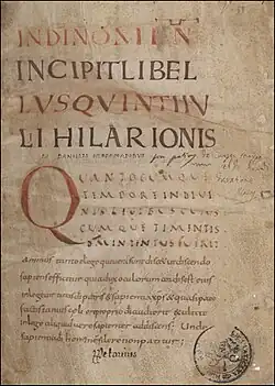 - Chronologia siue Libellus de mundi duratione (or De cursu temporum), a treatise on salvation history written later in 397.[1][2] It argues that the Second Coming will occur in 498, when the Earth is 6,000 years old. There will follow the thousand-year reign of Christ and a final battle. Since the end of the world is placed beyond the lifetime of Hilarianus or his initial audience, the Libellus does not seem to be a response to contemporary events but "a statement about hope for life eternal". Its brand of millenarianism, however, soon came to be regarded as heresy, making Hilarianus "one of [its] last vocal proponents".[2] Nevertheless, in two groups of manuscripts the Libellus was incorporated into the compilation known as the Chronicle of Fredegar. In one group, it replaces the contribution of the Liber generationis.[3] The 9th-century manuscript Reginensis 213 opens with it.[4][5]