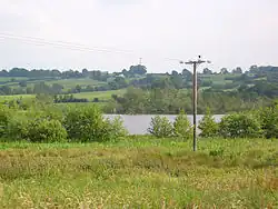Quoisley Meres lie on the Cheshire Plain, near the boundary with Shropshire, at an average elevation of around 75 metres.[1] In common with the majority of meres in the Meres and Mosses natural area, they probably represent glacial kettle holes, formed at the end of the last ice age, some ten or fifteen thousand years ago.[2][3][4] The meres are located immediately south of the track from Wirswall Road to Mere Farm, around ¾ mile west of the village of Marbury; the nearest town is Whitchurch, around 2½ miles to the south. There are two meres; the larger, Quoisley Big Mere, is at SJ546455, and the smaller, Quoisley Little Mere, at SJ549455. A narrow strip of woodland, Holly Rough, lines the farm track immediately to the north of Little Mere.[1] The catchment area of the meres is 136 hectares (340 acres).[5]