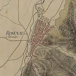 Râșnov town and fortress on the Josephine Map of Transylvania (c. 1770)