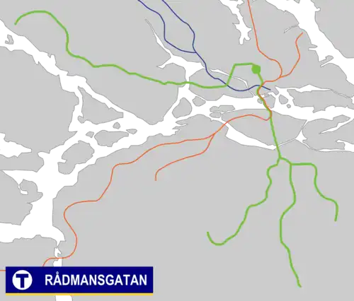 Rådmansgatan is an underground station on the Green line of the Stockholm metro. It lies below Sveavägen between its junctions with Rådmansgatan and Rehnsgatan in the district of Vasastaden and borough of Norrmalm in central Stockholm. The station has a single island platform, some 8 metres (26 ft) below street level, and is accessed via a pair of ticket halls at each end of the station. The ticket halls are accessed via staircases and lifts from the street above.[2][3]