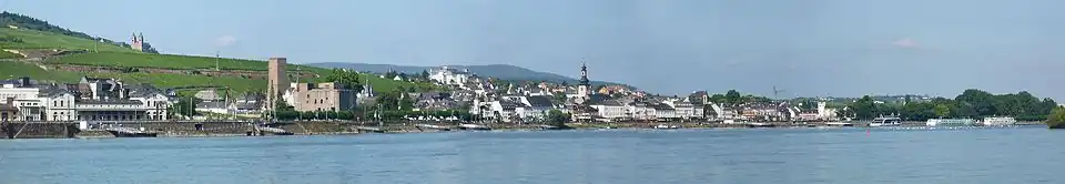 Rüdesheim borders in the north and north-west on the town of Lorch, in the east on the town of Geisenheim. On the left bank of the Rhine in Rhineland-Palatinate, Rüdesheim faces the town of Bingen to the south, and the villages of Weiler and Trechtingshausen to the south-west. Rüdesheim is connected with the left Rhine bank by a ferry for pedestrians and one for cars.
