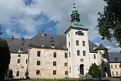 The Church of Saint Michael is originally a Gothic building. Its existence is proven already in the first half of the 14th century. After the fire in 1609 it was reconstructed in the Renaissance style. The original gothic tower was equipped with a wooden porch and a helmet with four turrets in the corners, the slender gothic windows were partly walled up. After the fire in 1790, a reconstruction took place during which Neoclassical and Neorenaissance elements were added. The alterations were not completed until 1818 by restoring the church tower to its present appearance. The interior of the church is decorated with paintings of Johann Christoph Handke.[11]