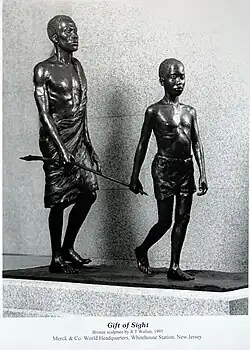 Wallen donated his time to the River Blindness Foundation to create a small sculpture of a blind African man being led by a child, a common sight in many parts of Africa where River Blindness (Onchocerciasis) blinds many people.[18] John Moores (baseball), founder of the River Blindness Foundation, paid for the casts, which were intended to be given as gifts to major donors to the foundation. The foundation eventually partnered with the Carter Center, which asked for another edition of small sculptures to give to donors who contributed $1 million or more to the effort to eradicate the disease.[19] With the World Bank and other organisations, they led the programs to distribute the drug Ivermectin (Mectizan) which had been developed and donated by Merck and Co.[20][21]
