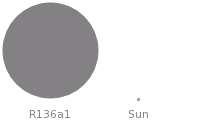R136a1 is over forty times the radius of the Sun (42.7 R☉; 29,700,000 km; 1⁄7 au) which corresponds to a volume nearly 80,000 times larger than the Sun.[4]