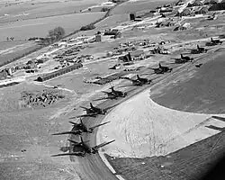 ![]() Dakotas of No. 233 Squadron RAF lined up on the perimeter track at RAF Blakehill Farm, for an exercise with the 6th Airborne Division, 20 April 1944 | |||||||||||