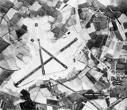 The airfield's main runway was 6,000 ft and aligned 10–28, the secondaries 4,200 ft at 17–35 and 3,660 ft at 04–22. All 50 hardstands were loop types in concrete with bituminous surfaces connecting to an enclosing perimeter track, of a standard width of 50 feet.[6]