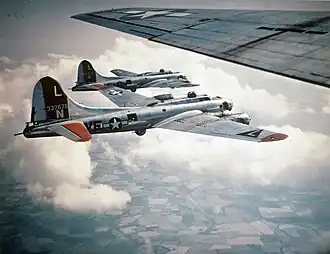 B-17s of the 381st Bomb Group, Ridgewell Airfield England, en route to targets over Nazi-occupied territory. The aircraft in the foreground is Boeing B-17G-70-BO Flying Fortress, AAF Ser. No. 42-31443, "Friday the 13th" of the 532d Bomb Squadron. This aircraft was lost on 22 February 1944 on a mission to Oschersleben, Germany.