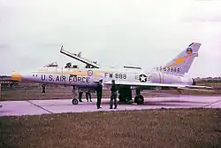 In 1955, the 79th was upgraded to the swept-wing F-84F Thunderstreak, with the older "G" models being transferred to other NATO countries or to the Middle East. Lightning flashes were not painted on the "F" models, but the yellow squadron colour band around the extreme rear of the fuselage remained a squadron marking. The 79th flew the F-84F only until 1958 when the 20th was re-designated a tactical fighter wing (20th TFW), and the squadron (now 79th TFS) was re-equipped with the North American F-100 Super Sabre.