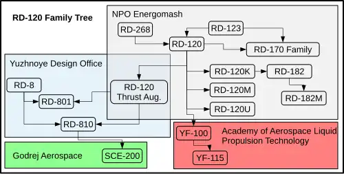 Not considering straight variations of the RD-120, this very influential engine has been the foundations of many engines spanning derivatives in four countries. The Ukrainian RD-801 and RD-810, the Chinese YF-100 and YF-115, as well as the Indian SCE-200 can be traced directly back to the RD-120. The Soviet/Russian RD-170 family of engines base developed on the lessons learned from the RD-120 project.