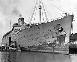 For three months the ship lay idle in New York, docked alongside RMS Queen Elizabeth, RMS Queen Mary, and the French Line's SS Normandie,[1] until it was decided to use her as a troopship. On 20 March 1940 she sailed from New York to Sydney, via Panama, to be converted for her new role.[1] This conversion work was carried out in April and in May she left Sydney as part of one of the greatest convoys ever mustered for the transport of troops. With her were Queen Mary, Queen Elizabeth, and Aquitania, with 2,000 troops, bound for the River Clyde via South Africa. Other notable liners in this great convoy were RMS Empress of Britain, RMS Empress of Canada, RMS Empress of Asia, and SS Nieuw Amsterdam. During the early stages of the war the ship transported Australian troops to Suez, India and Singapore but later she mainly served in the North Atlantic. In addition she shuttled Italian prisoners of war from the Middle East to South Africa, for internment, after their defeat in North Africa. Like Aquitania, she amassed over 500,000 nautical miles (930,000 km) during the course of her war duties, first crossing of the Indian Ocean, then working the Atlantic with American and Canadian troops and finally serving in the Pacific. One of her wartime voyages, of 28,662 nautical miles (53,082 km), took her right around the world, taking 82 days to complete. During this epic voyage she established a speed record for the crossing time from Fremantle, Australia to Durban, South Africa. The 4,000-mile (6,400 km) distance was covered in 8 days and 19 hours at an average speed of 21.06 knots (39.00 km/h). Another wartime troop transport voyage began in New York on 10 May 1943 and ended in Bombay on 24 June 1943, with calls en-route at Trinidad, Rio de Janeiro, Cape Town and Diego-Suarez. On 8 January 1944 she was involved in a minor collision with the American tanker Hat Creek in New York harbour.