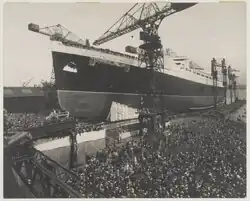 RMS Mauretania was a British ocean liner that operated from 1939 to 1965. The ship was launched on 28 July 1938 at the Cammell Laird yard in Birkenhead, England, and was completed in May 1939. She was one of the first ships built for the newly formed Cunard-White Star company following the merger in April 1934 of the Cunard and White Star Line. On the withdrawal of the first Mauretania in 1935, to prevent a rival company using the name and to keep it available for the new liner, arrangements were made for the Red Funnel paddle steamer Queen to be renamed Mauretania in the interim.[2]