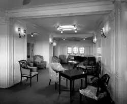 Her public saloons were in historicist styles: Louis XVI for her first class lounge, music room and dining saloon; Dutch colonial for her first-class smoking room[13] and Adam style for her first class writing room and library. The first-class smoking room had a wooden floor of inlaid sycamore.[15]
