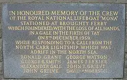 At 3:13 am on 8 December 1959, the Mona was launched to assist the North Carr Lightship, which was reported adrift in St Andrews Bay.[2] Weather conditions were exceptionally severe, with a strong south-easterly gale, and the Broughty Ferry lifeboat was the only boat in the area able to launch. The Mona was seen clearing the Tay and heading south into St Andrews Bay. Her last radio message was at 4:48 am. As the Mona was struggling to reach the North Carr reef, off the coast of Fife, the lightship's crew of six were able to drop their spare anchor. They were all rescued alive and well by helicopter the next morning, 24 hours after the first call for help had gone out. After a helicopter search, the Mona was found capsized on Buddon Sands. Her crew of eight (Ronald Grant, George Smith, Alexander Gall, John Grieve, George Watson, James Ferrier, John T. Grieve and David Anderson) had all drowned. The boat was burned on the beach.