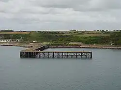 In 1934, the Admiralty purchased Thomas Ward's ship breaking yard. Construction work began the following year and by the outbreak of war in 1939 the Depot was ready for action.[2] The site consisted of an extensive storage facility of six armament sheds, comprising tunnels built into the neighbouring valley. A reservoir was constructed on higher ground to the north in case of explosion or fire.[3] All of the tunnels were connected by rail, which also extended to the pier. Housing for the naval officers was located near the former mansion of Castle Hall. At the height of World War II, it employed 1,000 people, and thereafter hundreds of people from the local area. By the 1970s its future was identified as being at risk.[4]