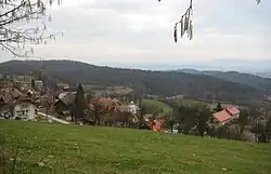 During the Second World War, German forces burned the village on September 20, 1941 and evicted the population in retaliation for an attack on a convoy of German cars two days earlier.[6] This was the first village in Slovenia to suffer this fate.[4] A lookout tower and shelter were built on the peak above the village in 1957.[4] On September 21, 1958, Rašica Peak was renamed Stane Kosec Peak (Slovene: Vrh Staneta Kosca)[4][7] in honor of the Partisan Stane Kosec.
