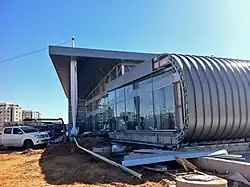 The station building is of the shape of a book lying on its side. Its floor area is 600m², and is connected through a 50m footbridge to the platforms, which are below ground. Each platform is 300m long.