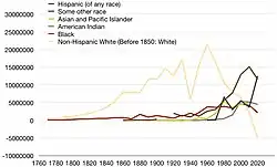 | Asian and Pacific Islander | 264,766[q] | 254,918[r] | 321,033[s] | 980,337 | 1,526,401 | 3,500,439 | 7,273,662 | 10,641,833 | 15,214,265 | 20,576,015 |