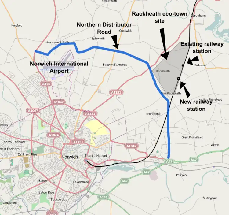 The development will be well connected to the road network. The A1151 road runs to the west of the settlement and the proposed Norwich Northern Distributor Road dual-carriageway (NDR) which would run to the south and link the settlement with the A47 road to the east and the A140 road / Norwich International Airport to the west.[19]