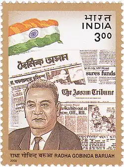 Radha Govinda Baruah (17 October 1900[1] – 15 July[2] 1977[1][2]) was the founder of The Assam Tribune, a group of news papers. Radha Govinda Baruah, an enterprising person in Dibrugarh, first conceived the idea of launching an English daily. With some help from his friends and well wishers, he brought out an English weekly newspaper instead of a daily on 4 August 1938 under the editorship of Lakshminath Phookan, former editorial staff of Hindustan Standard, a leading daily of Anand Bazar Group, Kolkata.[3] He founded the Assam Tribune in 1939.[4] He was a sports enthusiast,[1] who was president of the Assam Cricket Association for over a decade.[2] The iconic Nehru Stadium in Guwahati was built under his leadership in 1962. He is also noted for his contributions to the society and culture of Assam.[1][2][4] RG Baruah was instrumental in opening the first bank in Assam, the Imperial Bank Of India (Now State Bank Of India) in 1923. He is called "the architect of modern Assam"[1][5] for his being "instrumental in realising the educational needs" of the Assamese people.[5] Radha Govinda Baruah College (or R G Baruah College) in Guwahati is named after him. He is also called the Singhapurush ("Lion Man") for his immense bravery and enthusiasm.[5]