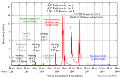 Radiation fluctuated widely on the site after the tsunami and often correlated to fires and explosions on site. Radiation dose rates at one location between reactor units 3 and 4 was measured at 400 mSv/h at 10:22 JST, 13 March, causing experts to urge rapid rotation of emergency crews as a method of limiting exposure to radiation.[99] Dose rates of 1,000 mSv/h were reported (but not confirmed by the IAEA)[100] close to the certain reactor units on 16 March, prompting a temporary evacuation of plant workers, with radiation levels subsequently dropping back to 800–600 mSv/h.[101] At times, radiation monitoring was hampered by a belief that some radiation levels may be higher than 1 Sv/h, but that "authorities say 1,000 millisieverts [per hour] is the upper limit of their measuring devices."[102]
