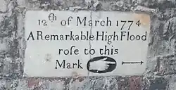 Radnor House's riverside gardens to the east included part of Cross Deep Ait, a former larger neighbour of adjacent Swan Island. The two aits are shown as single entity on John Rocque's map of 1746. A footbridge connected the island, metal remnants of which can still be perceived lining the central footpath in the gardens today. The picture View of the Earl of Radnor's House by Augustin Heckel, engraved by Anthony Walker in 1750 shows the house and garden from the river, with Cross Deep Ait in the foreground and Cross Deep House and riverside garden to the south.[3] A notable flood that occurred on 12 March 1774 is commemorated by a stone plaque in the remaining wall of the house.