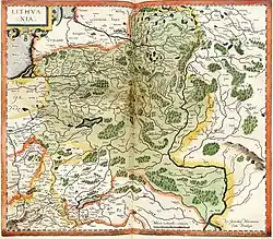 Magni Ducatus Lithuaniae,[a] or simply the Radziwiłł map, is a Latin map of the Grand Duchy of Lithuania created under the tutelage of Mikołaj Krzysztof "the Orphan" Radziwiłł. The map was likely first published in 1603 but no surviving copy is known. It was published in the Amsterdam printing house of Willem Blaeu as a wall map from 1613 to 1650s. It was also included in atlases published by Blaeu as a foldable insert in 1631–1649. In 1649, the map was redrawn to shrink it so it could fit on an atlas page. Valued for its accuracy and intricate detail, the map was modified and republished many times by various cartographers until the First partition of the Polish–Lithuanian Commonwealth in 1772.