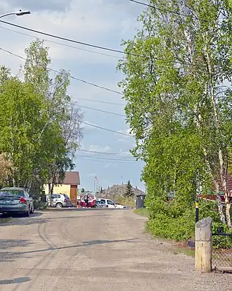 Ragged Ass Road is in a residential area midway between the intersection of Franklin (50th) Avenue, Yellowknife's main street, and School Draw Avenue, its lake shore road, and Yellowknife Bay on the north arm of Great Slave Lake.[3] The terrain is flat, at approximately 160 metres (520 ft) in elevation, reflecting the proximity of the lake.[4] The neighborhood is at the south end of the city's Old Town,[5][6] on a peninsula projecting into the lake's Yellowknife Bay.[4]
