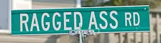 "Ragged Ass" street sign replicas are sold in the area. Nevertheless, the signs have been stolen so frequently that the city has had them welded to their posts.[18][19]