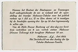 In Sumatra, the railway lines were separate, with the Deli Spoorweg Maatschappij operating in North Sumatra, the Atjeh Tram operating in Aceh, the Staatsspoorwegen ter Sumatra's Westkust operating in West Sumatra, and the Zuid-Sumatra Staatsspoorwegen operating in southern Sumatra. The Staatstramwegen op Celebes division operated to serve the South Sulawesi railway.[21] One embryo of a new Staatsspoorwegen division, namely Staatstramwegen in Tapanoeli, failed to be implemented.[22] Until the end of the 1920s, a feasibility study on the Trans-Kalimantan, North Sulawesi, Lombok, Bali railways was also being carried out.[23]