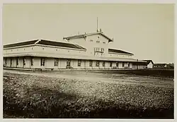 The idea of building a railway in Indonesia has emerged since the 1840s.[12] The construction of the railway line in Indonesia was initially a request from King Willem I. The purpose of its construction was for military purposes in the city of Semarang and the transportation of agricultural products to the Semarang warehouse. This idea was only realized with the establishment of a railway company called Nederlandsch-Indische Spoorweg Maatschappij (NIS), marked by its ratification as a legal entity on 27 August 1863. The purpose of building railways in the Dutch East Indies (the name of Indonesia at that time) was to facilitate the transportation of agricultural products. The first railway in the Dutch East Indies began with the laying of the first stone for the construction of a railway line on the first segment of the Samarang-Vorstenlanden (Yogyakarta) railway line, on 17 June 1864, in Kemijen, East Semarang, Semarang, which became the location of Samarang Station (km 0). The construction was marked by a ceremony led by the Governor General of the Dutch East Indies, Mr. L.A.J.W. Sloet van de Beele. On 10 August 1867, the line was completed.[12][13][13]