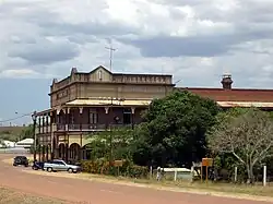 The Railway Hotel, on Barton Street opposite the Court House and the site of the railway station, is one of a handful of buildings left from the town of Ravenswood and is set in a mining landscape which consists of disturbed ground with scattered ruins and mullock heaps, set amongst distinctive chinkee apples and rubber vines.[1]